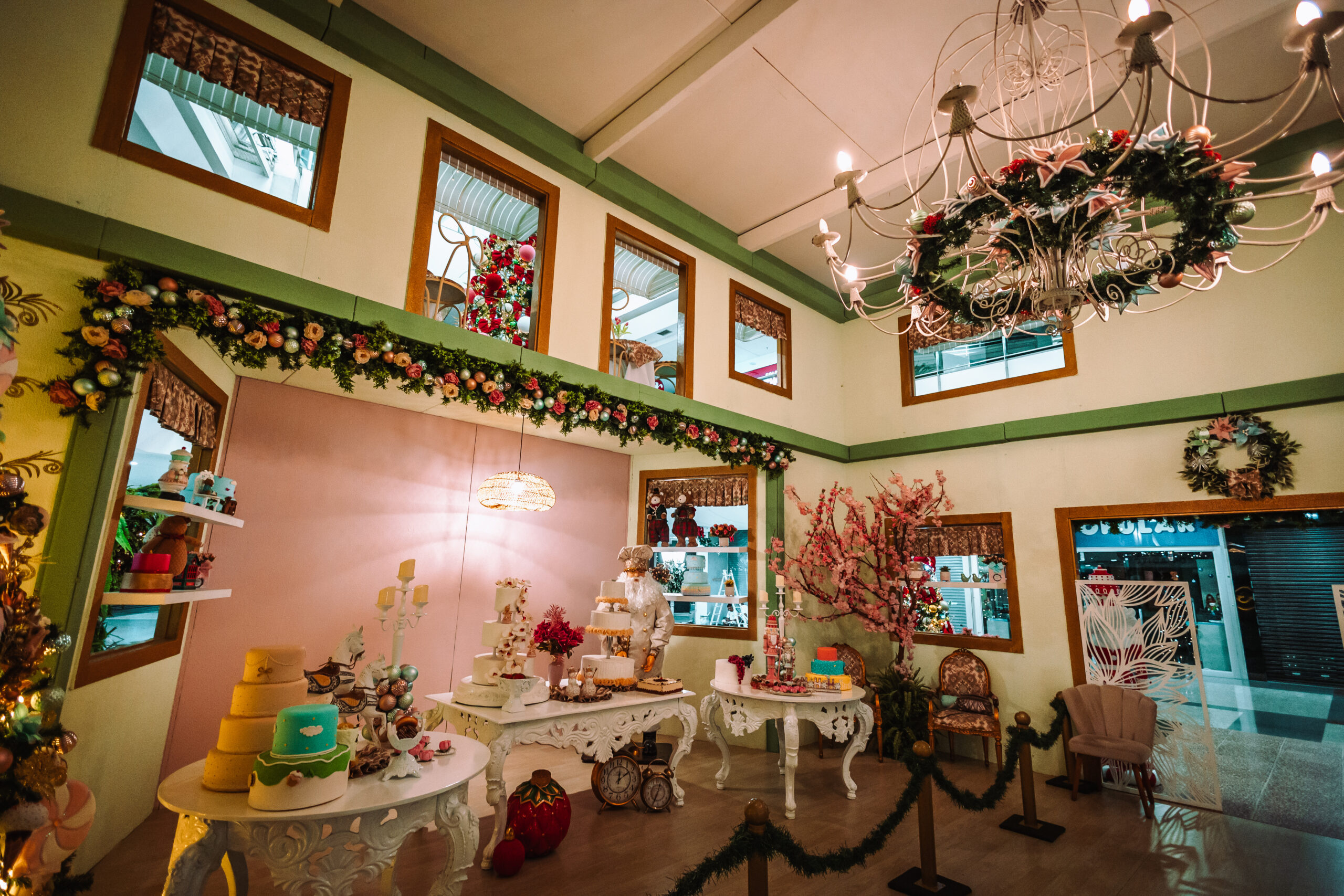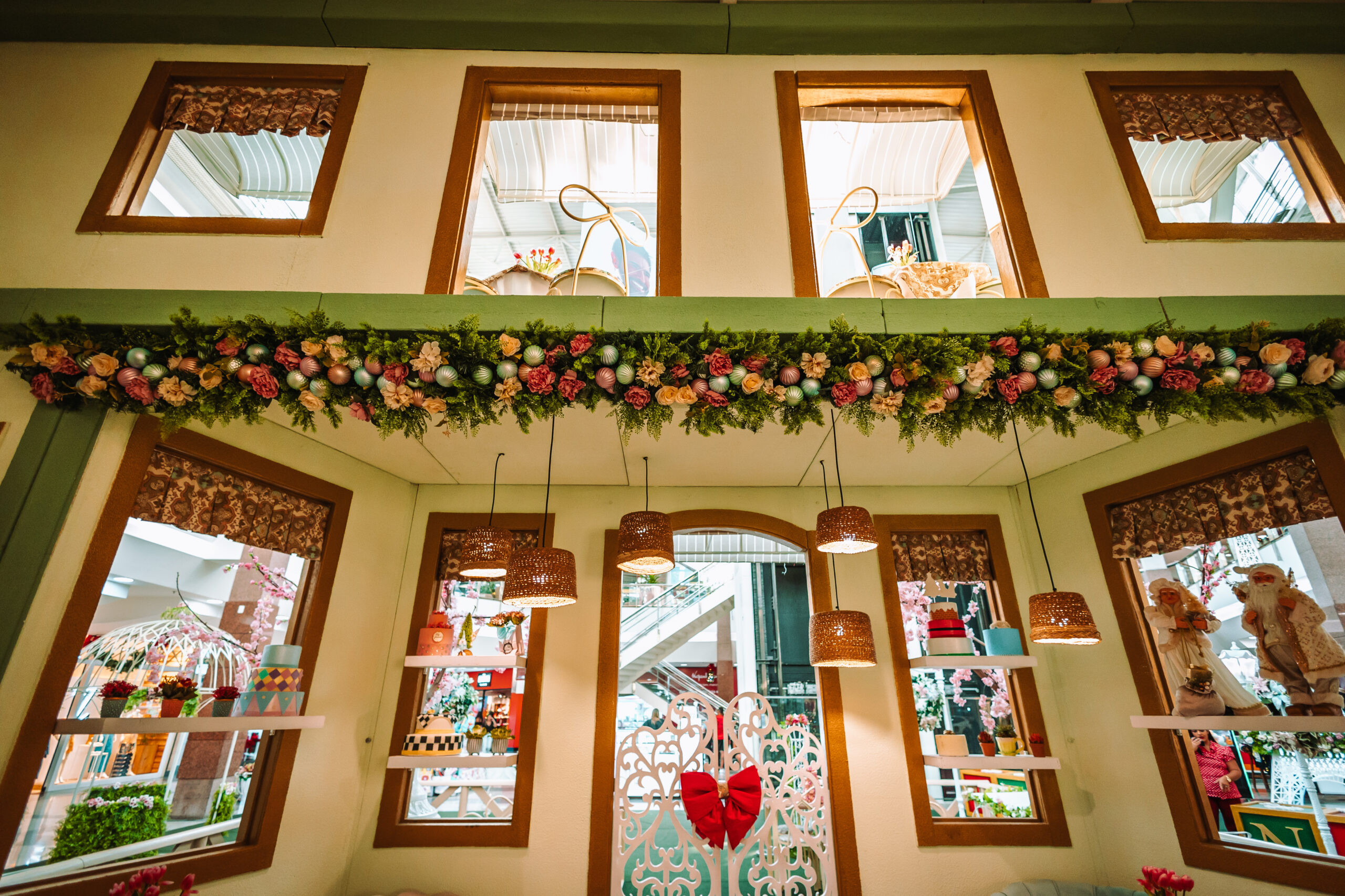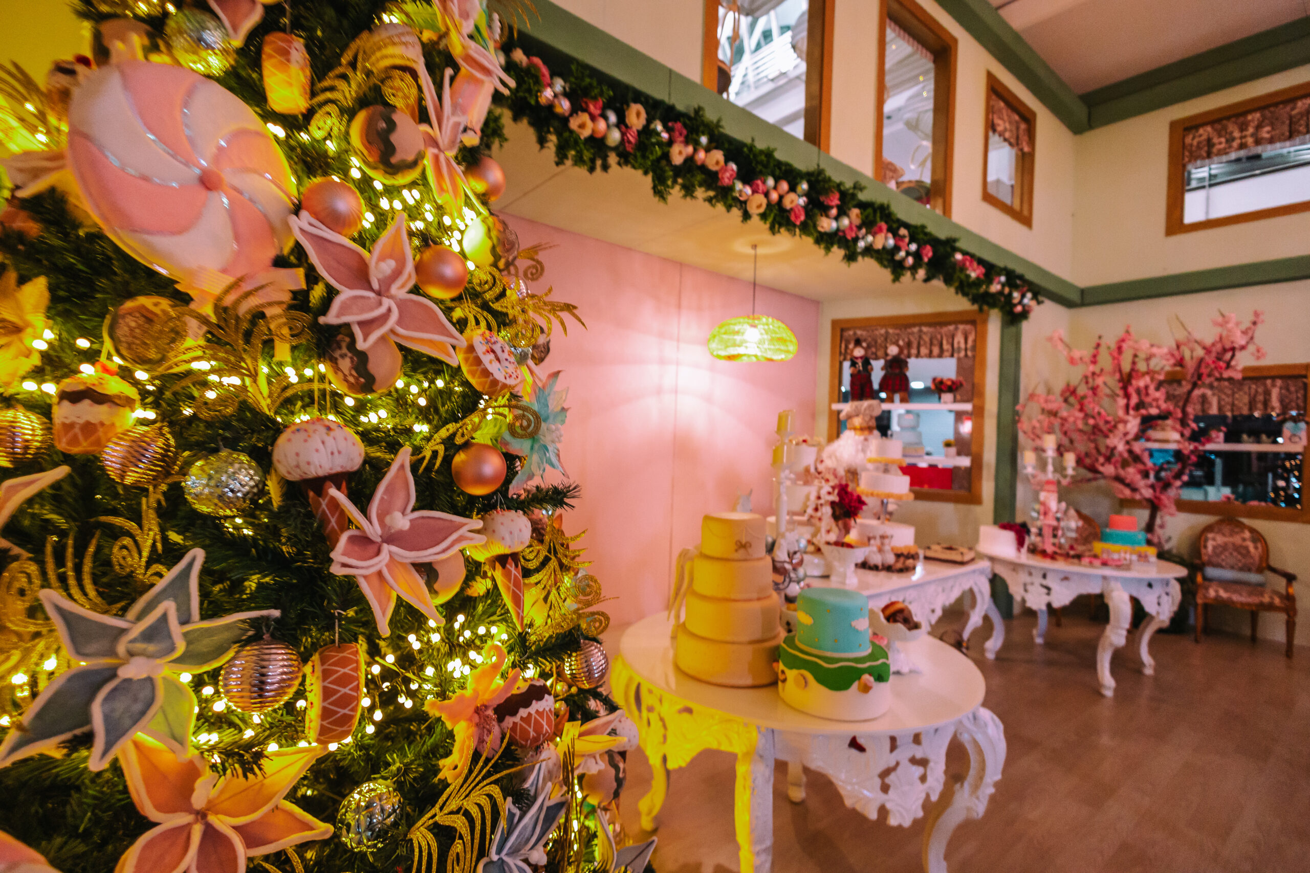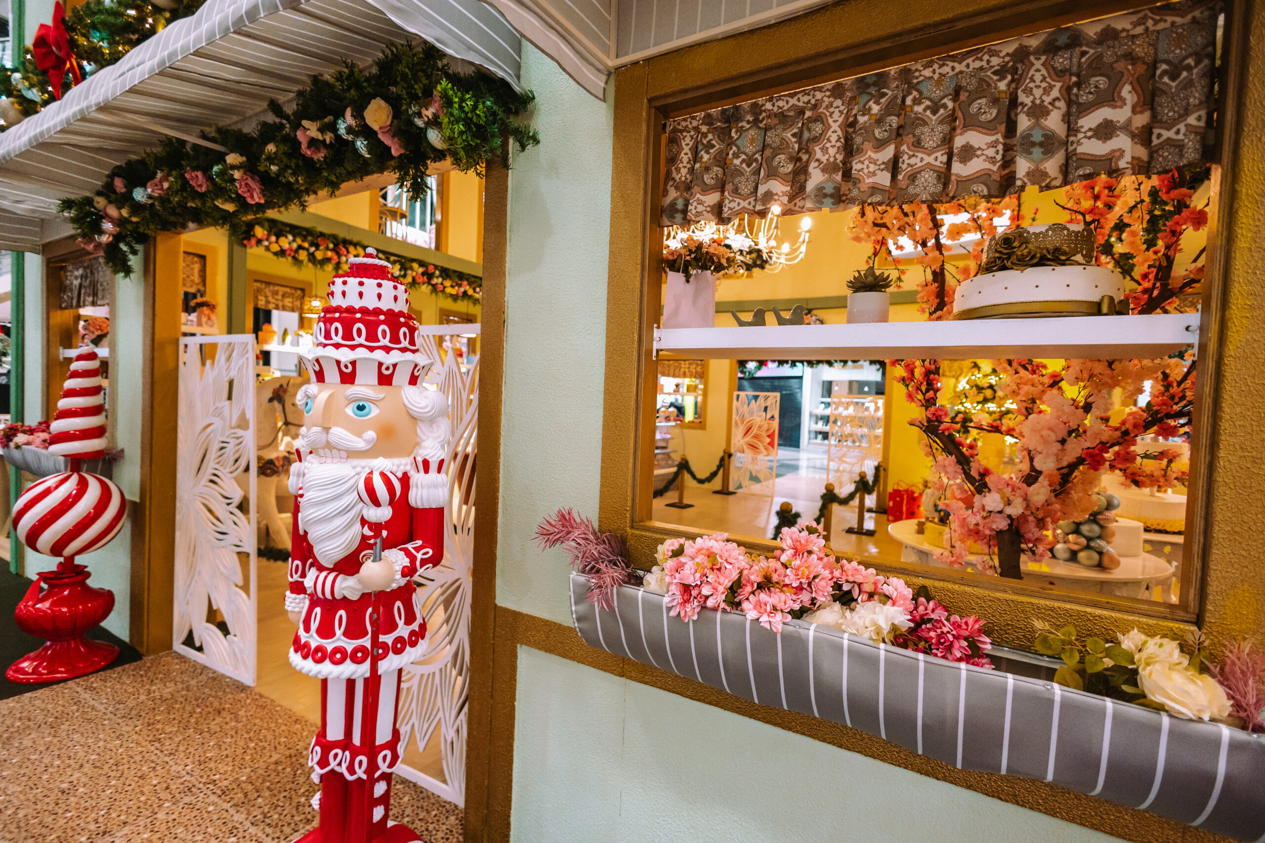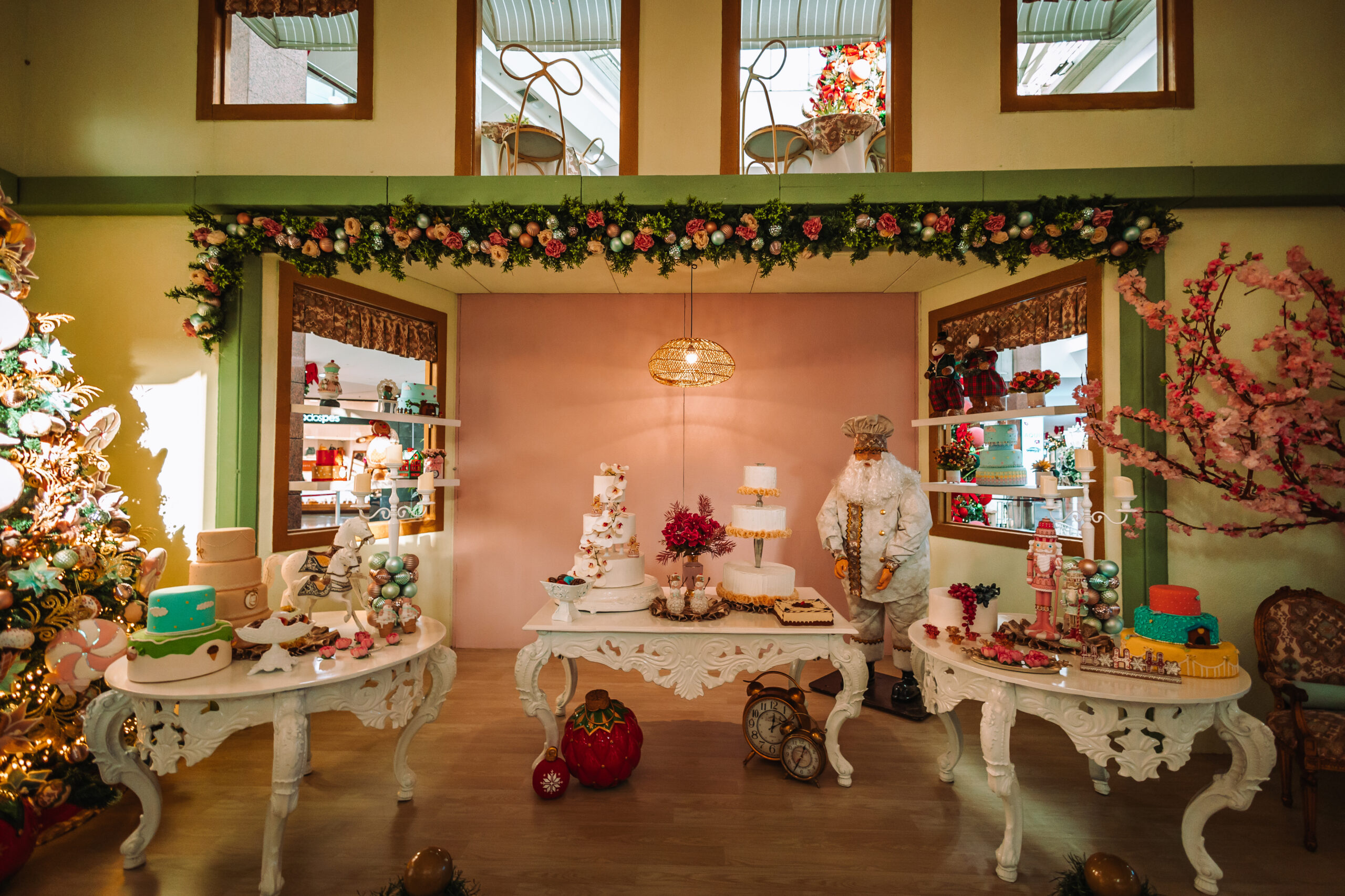 Ao se aproximar do bistrô, os olhos são imediatamente capturados pela fachada verde-clara com detalhes em madeira, guirlandas exuberantes, laços vermelhos e flores cintilantes. Os ares de confeitaria se destacam nas vitrines recheadas de miniaturas de bolos decorados, utensílios e doces cenográficos, que instigam a imaginação e aguçam a memória afetiva do Natal.