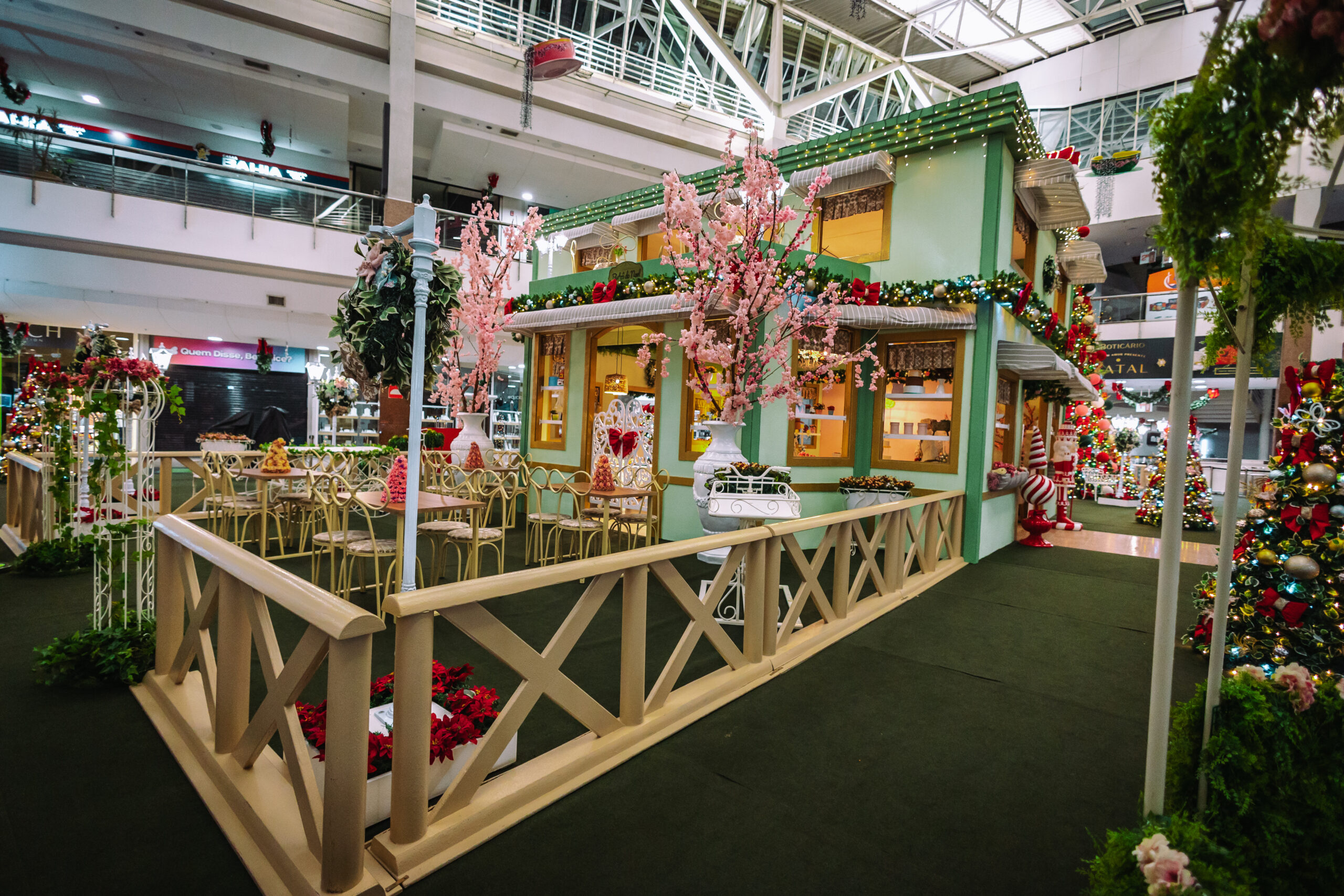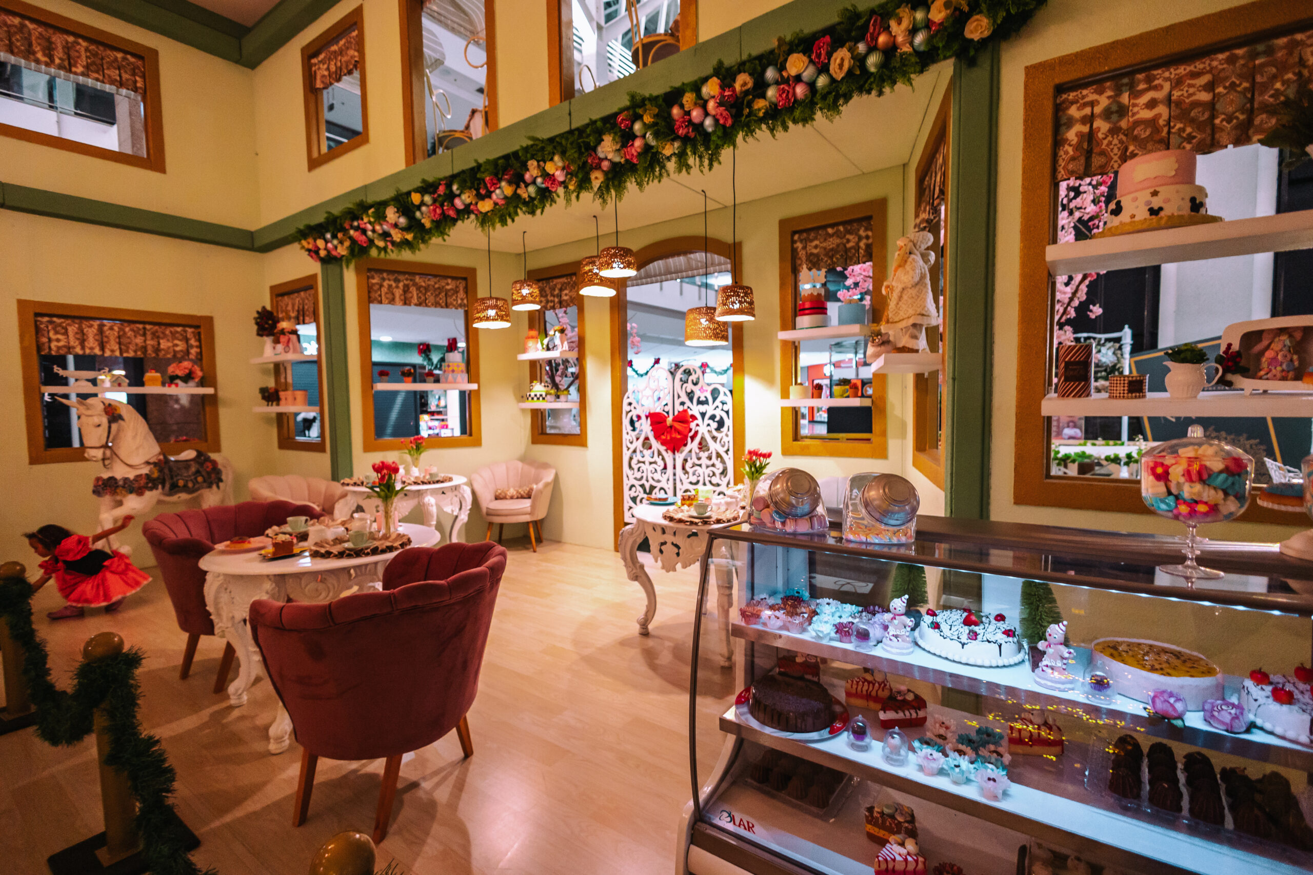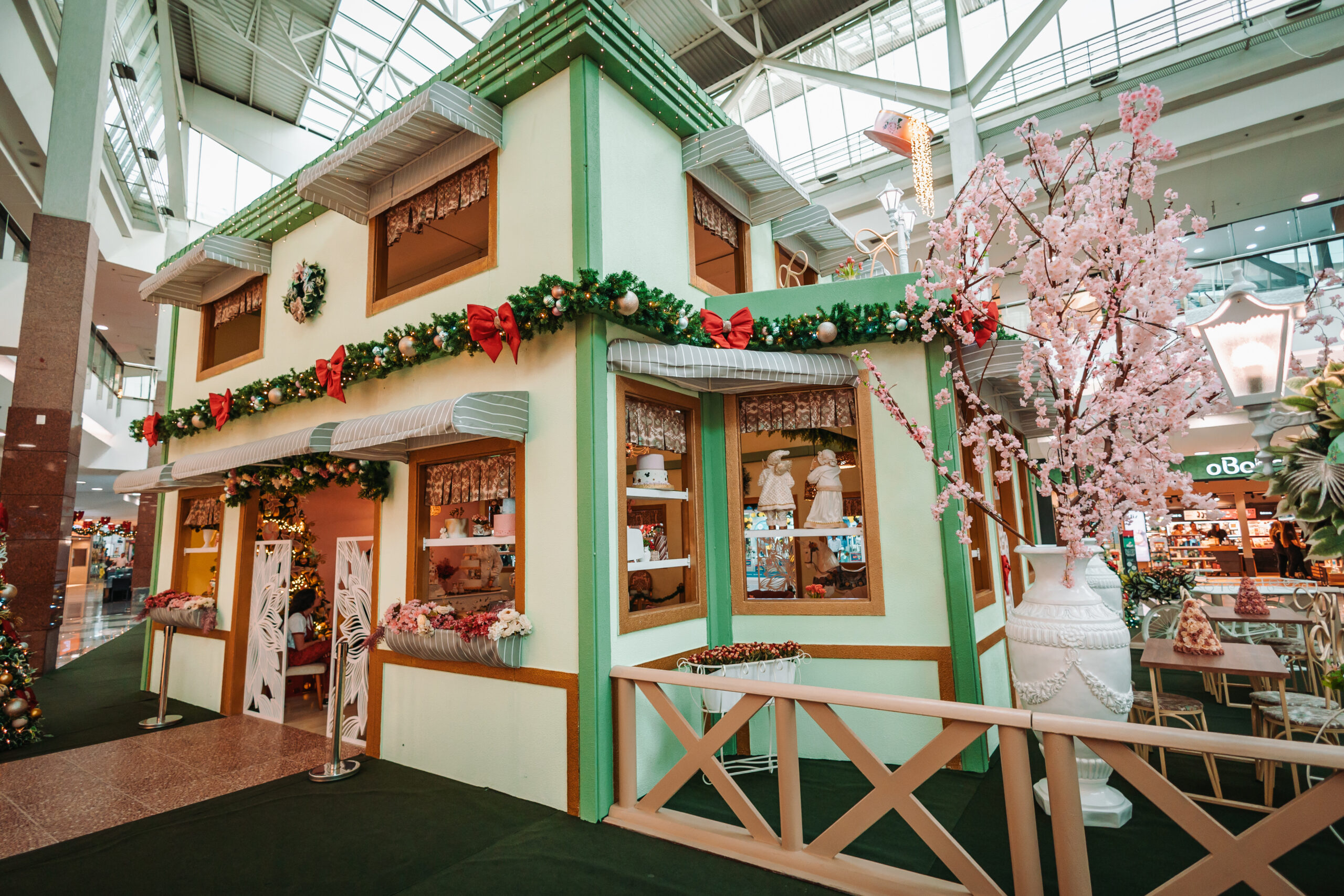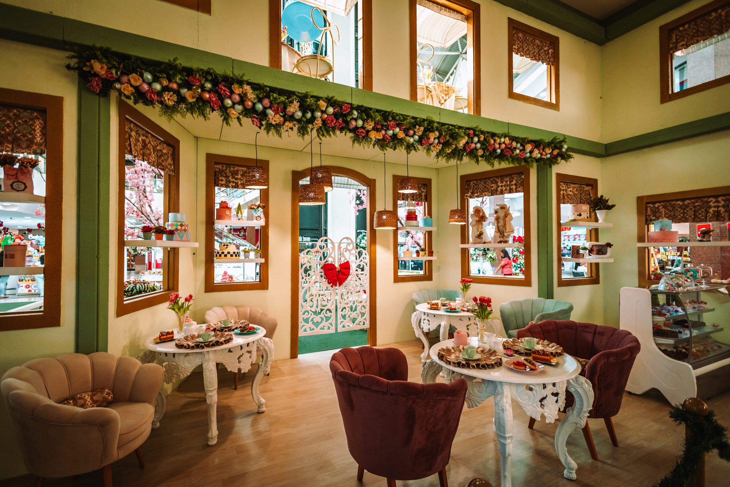 Ao se aproximar do bistrô, os olhos são imediatamente capturados pela fachada verde-clara com detalhes em madeira, guirlandas exuberantes, laços vermelhos e flores cintilantes. Os ares de confeitaria se destacam nas vitrines recheadas de miniaturas de bolos decorados, utensílios e doces cenográficos, que instigam a imaginação e aguçam a memória afetiva do Natal.