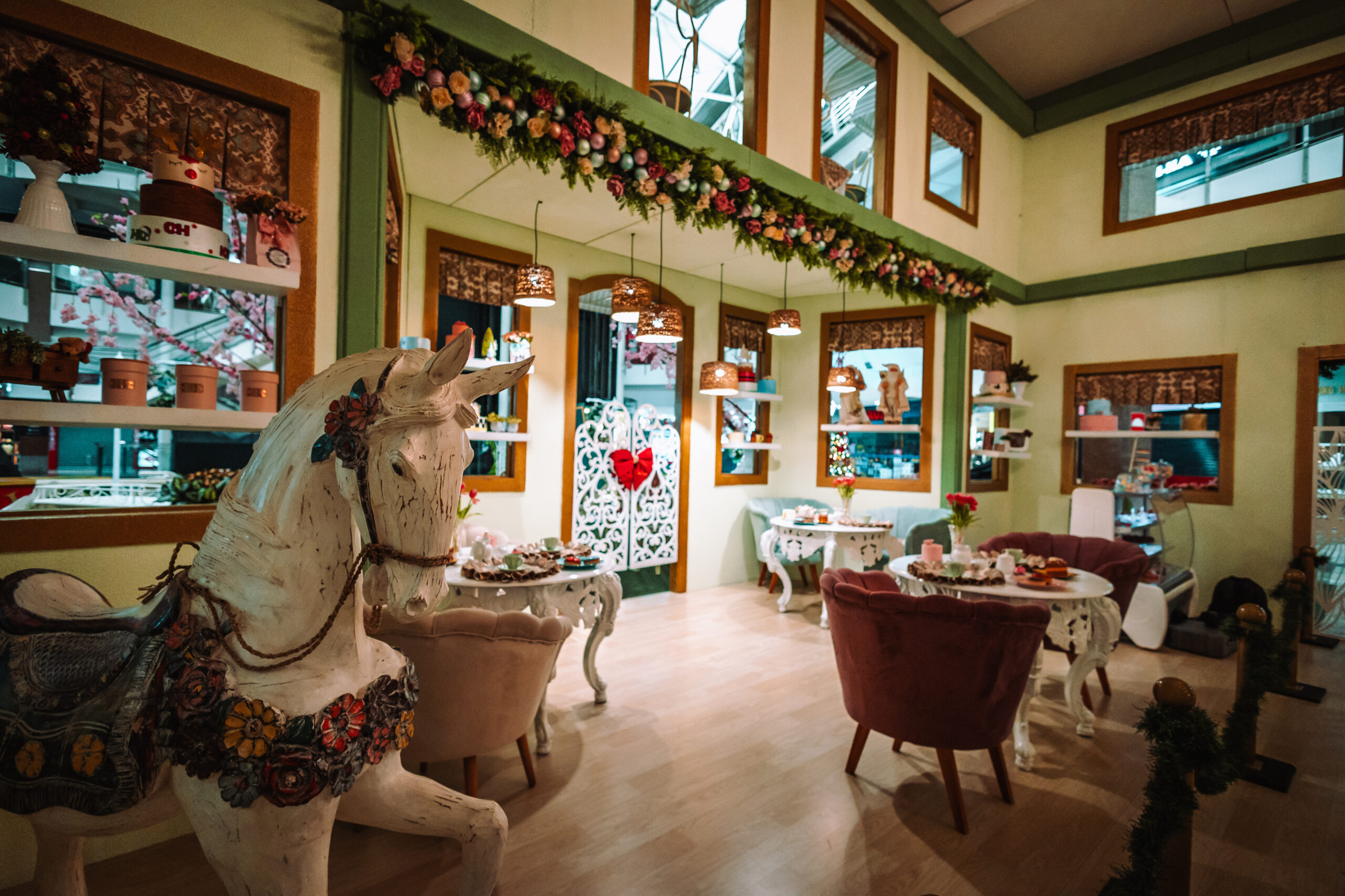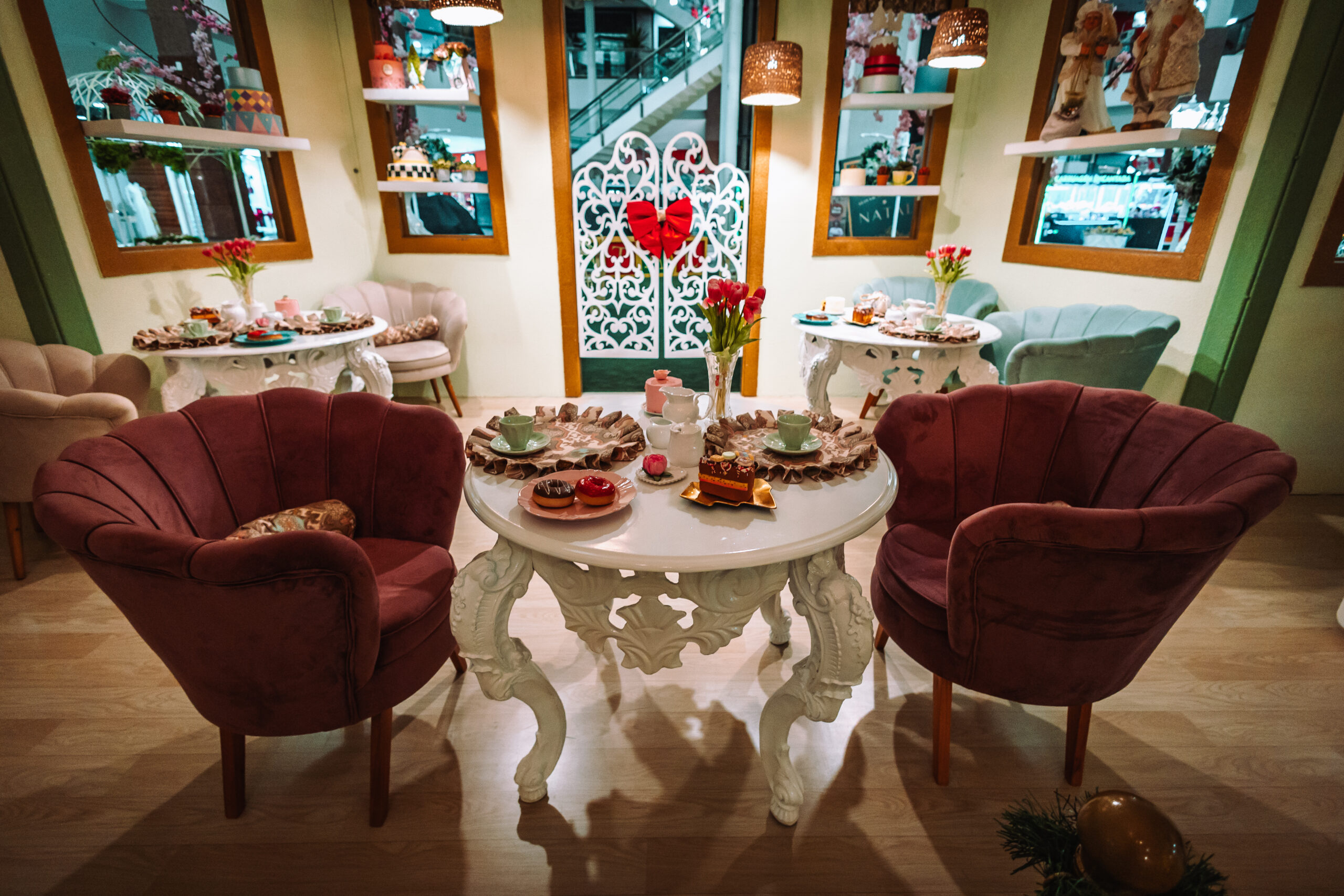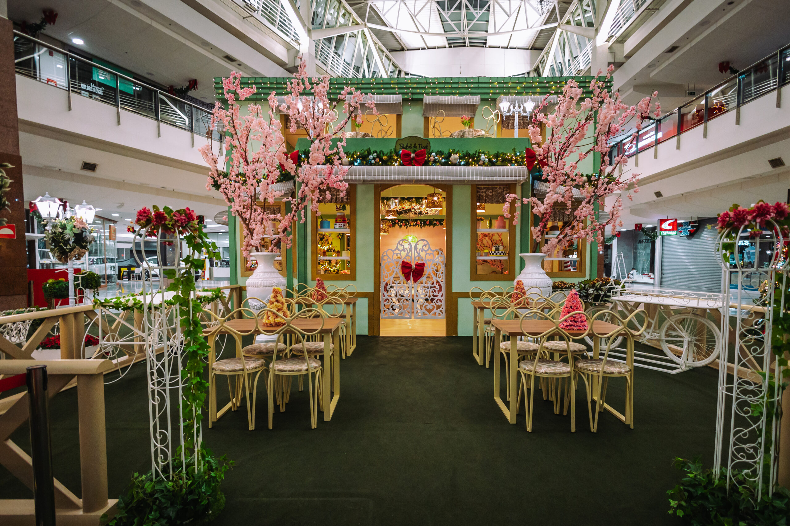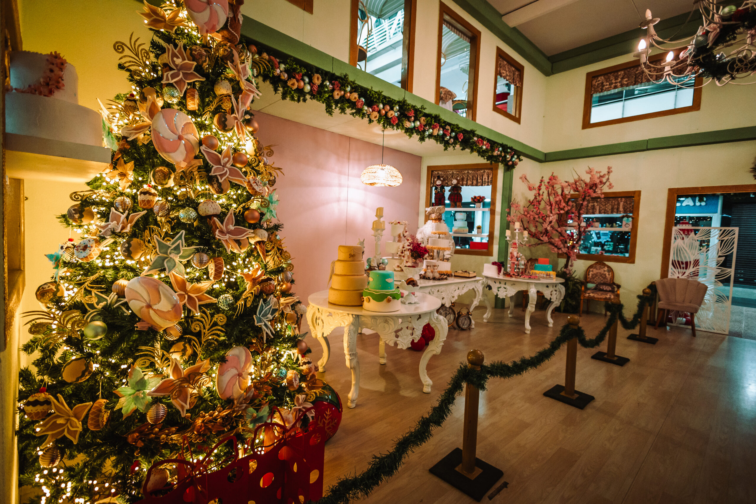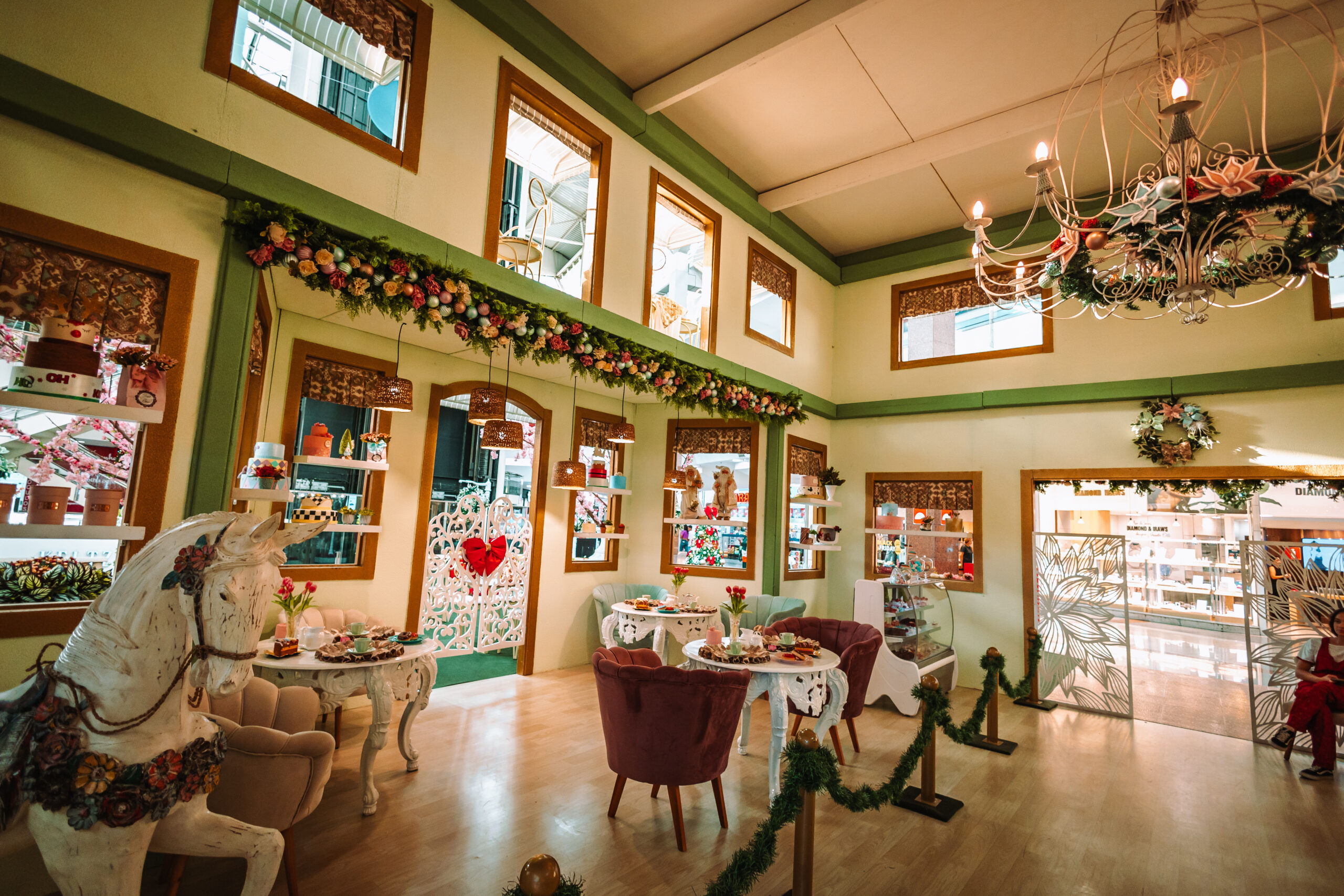 Ao se aproximar do bistrô, os olhos são imediatamente capturados pela fachada verde-clara com detalhes em madeira, guirlandas exuberantes, laços vermelhos e flores cintilantes. Os ares de confeitaria se destacam nas vitrines recheadas de miniaturas de bolos decorados, utensílios e doces cenográficos, que instigam a imaginação e aguçam a memória afetiva do Natal.