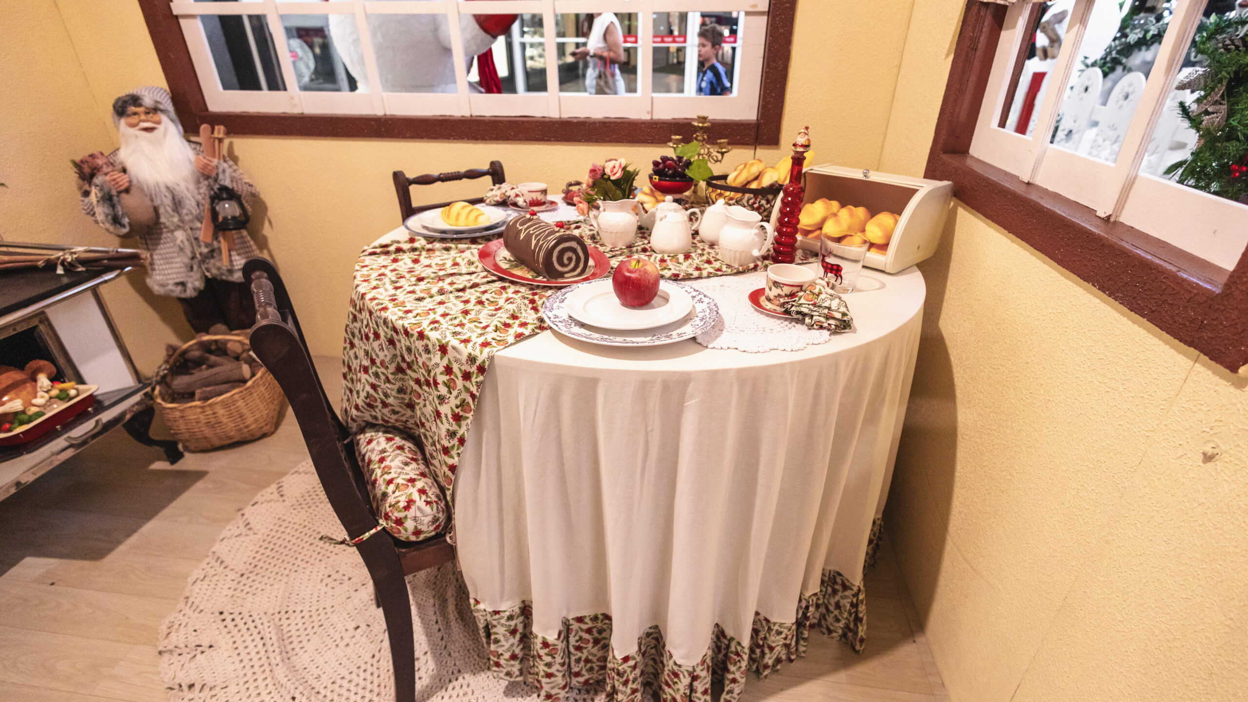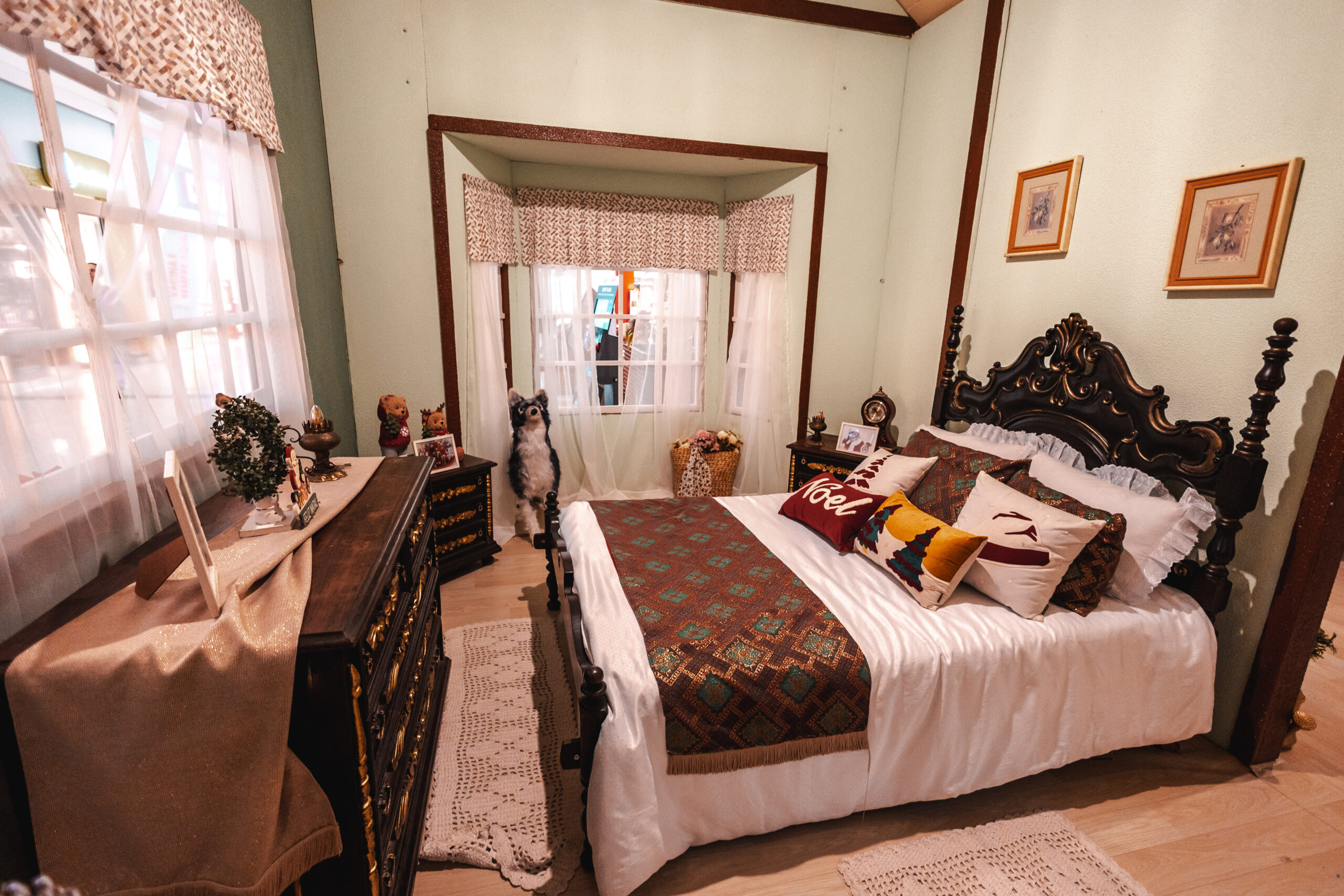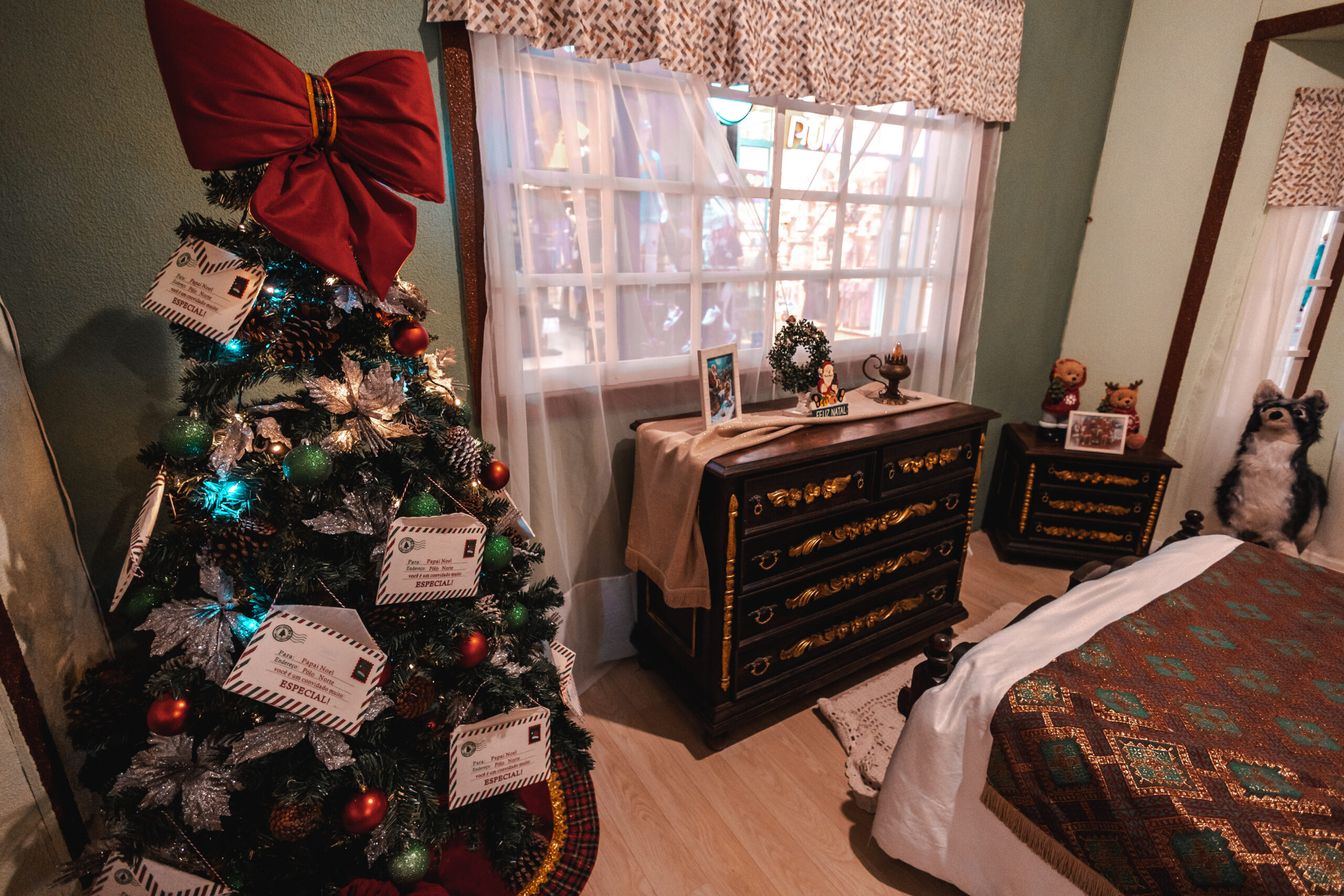 Dentro do chalé, cada ambiente aquece o coração: a cozinha exibe uma charmosa mesa posta com frutas, bolos e porcelanas decoradas, além de um fogão retrô com peru assado à vista. O quarto do Noel é acolhedor, com colchas festivas, almofadas bordadas e móveis em madeira nobre detalhados com dourado. Os cantos da casa são decorados com pinheiros repletos de cartinhas, enfeites clássicos e muita magia. Guirlandas, sinos, trenós, presentes iluminados e luminárias com detalhes florais criam a atmosfera perfeita de um inverno encantado. O “Chalé de Inverno do Noel” é o lar da fantasia natalina — um convite para reviver tradições, sonhar acordado e acreditar no espírito do Natal.