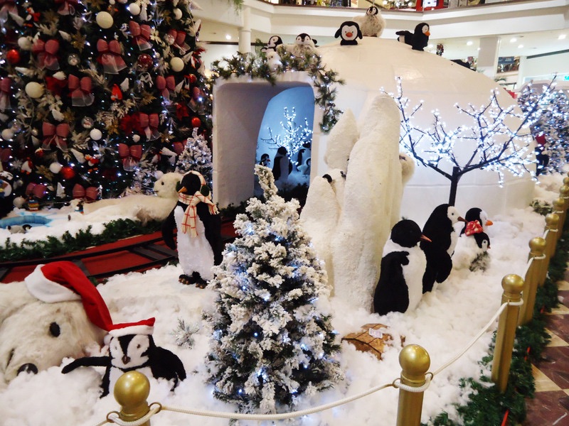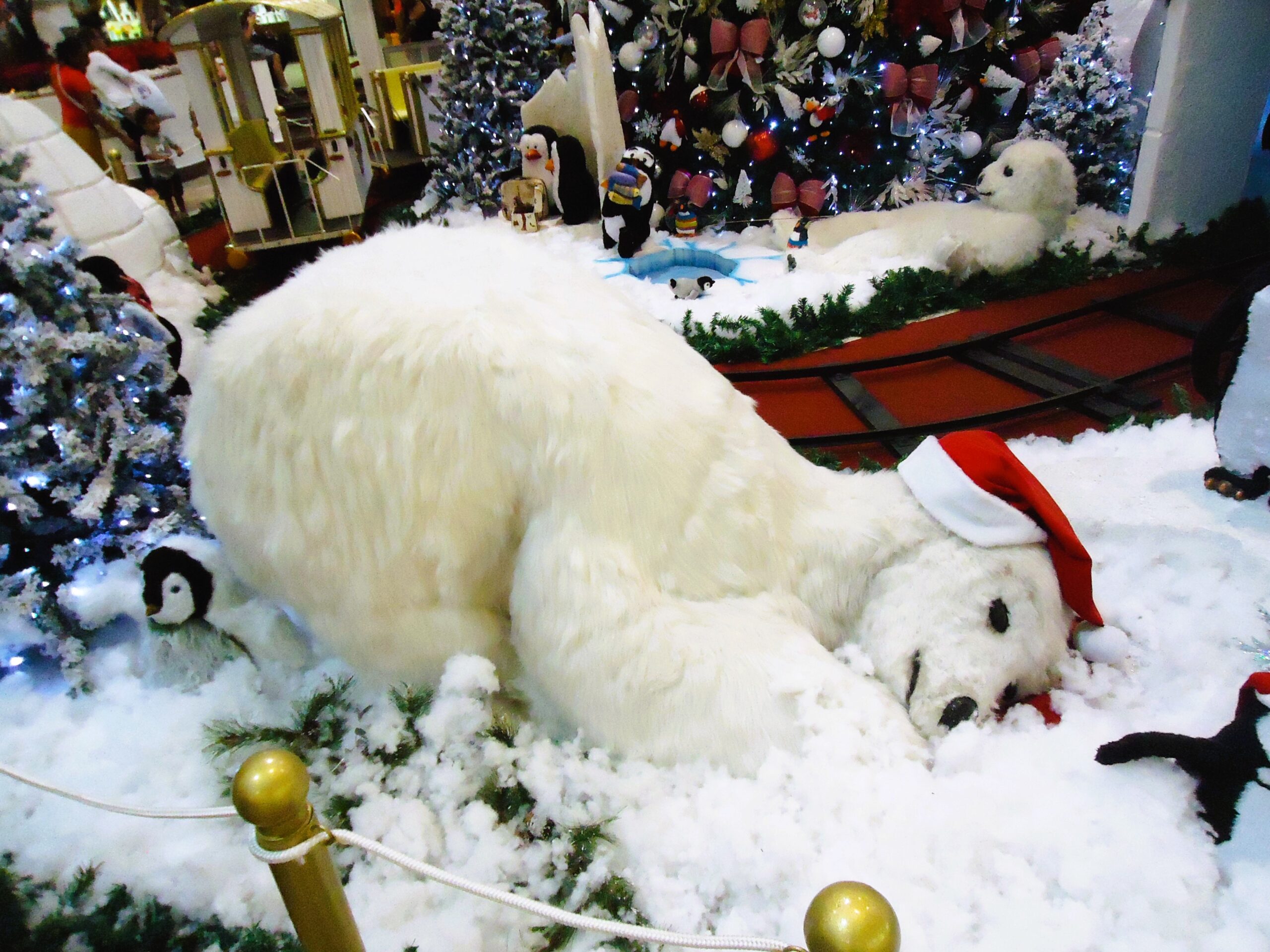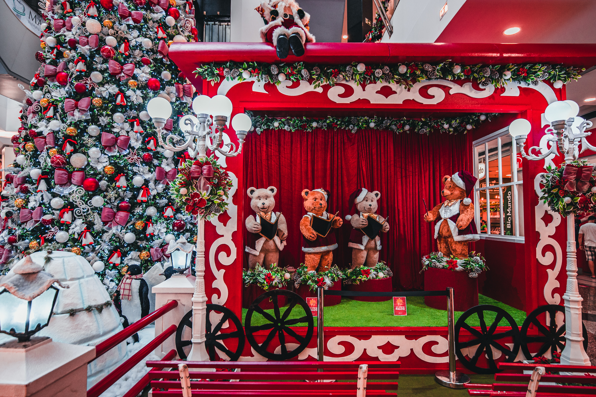 Há também cenários interativos com corujas de pelúcia sobre pedestais nevados, ursos adormecidos com gorros natalinos e painéis que remetem ao espírito lúdico e aconchegante do inverno.