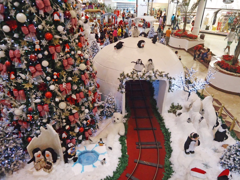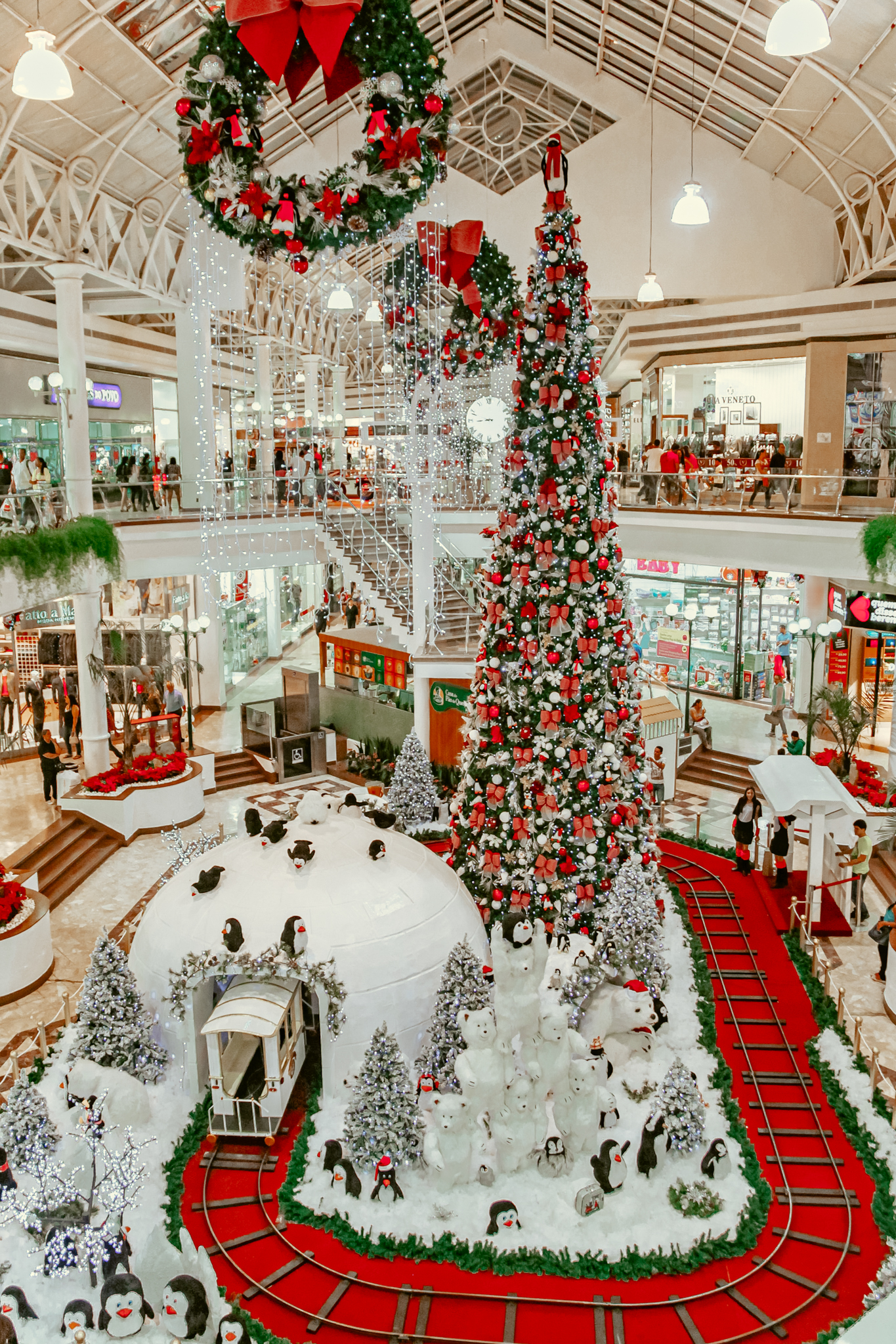 No coração da cena, uma majestosa árvore de Natal brilha em tons de vermelho, branco e prata, adornada com laços gigantes, bolas reluzentes e pequenos pinguins como enfeites. Ao redor, um charmoso trenzinho vermelho circula entre iglus iluminados, árvores decoradas e esculturas nevadas, convidando à imaginação.