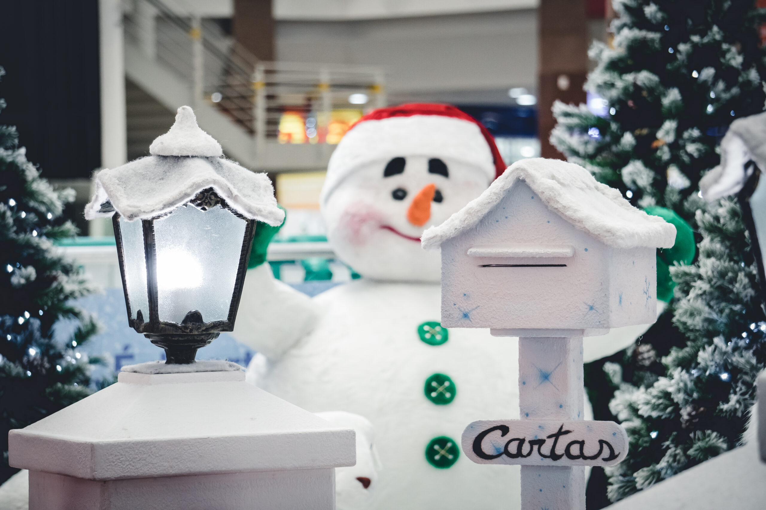 A vila gelada é completada por bonecos de neve sorridentes, cercas e luminárias natalinas, bancos vermelhos estrategicamente posicionados e pinheiros enfeitados que emolduram cada detalhe mágico.